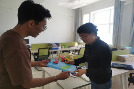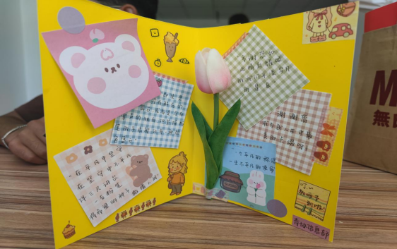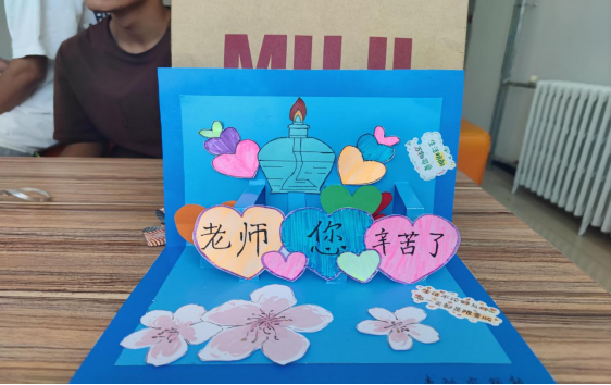 部分班级同学组织拍摄祝福视频,营造节日氛围。第二个板块是学生会和青年志愿者协会的成员“DIY”亲手做的祝福贺卡,同学们发挥自己的想象,利用各种材料动手做的精美贺卡,让收到贺卡的老师们都赞不绝口。第三个板块是学生会主席宁占平和青年志愿者协会会长李婕组织成员在教师节来临之际给各位老师送上贺卡,送上我们真诚的祝福。